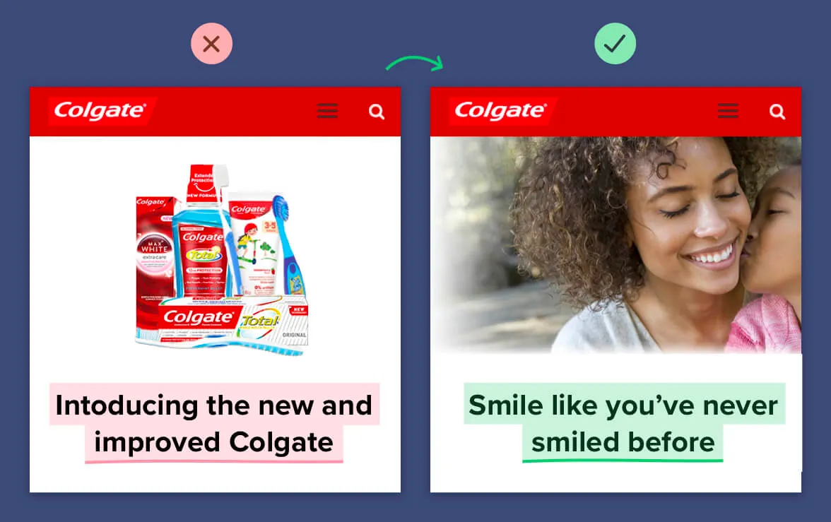 Think about why the image and copy on the right feel more relatable than those on the left.