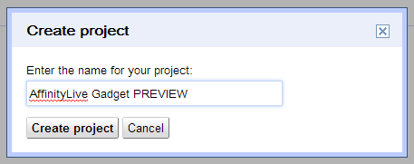 You'll want to give your project a name like "Accelo Gadget PREVIEW" - when the Gadget launches to everyone, you'll need to come back and delete this project, so making sure you give it a name like "Preview" will be handy for later.