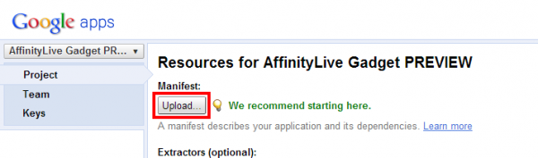 The next step is to upload the Manifest. This is the set of instructions that tells Google how to show the Gadget inside the Gmail window of all of your users.